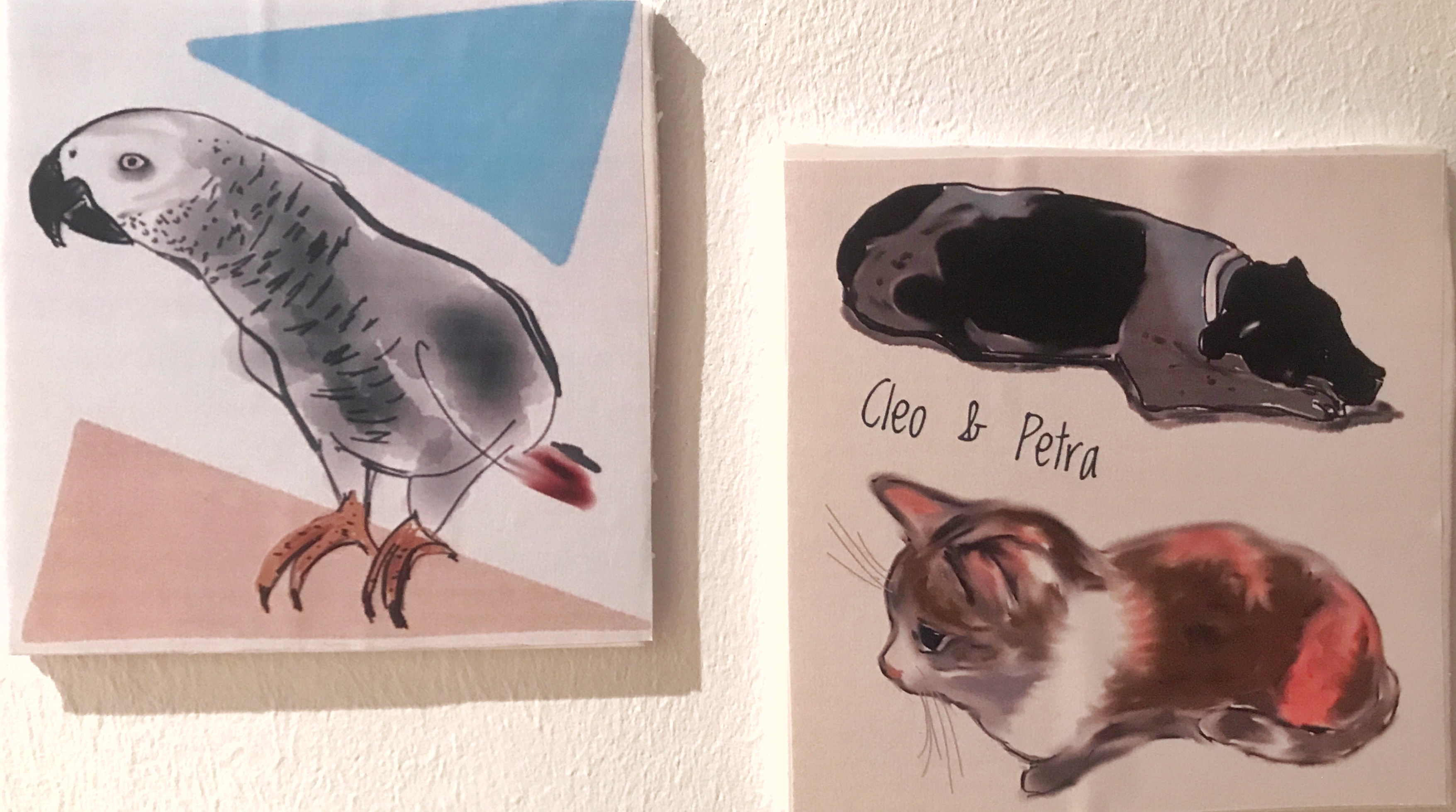 Los autores son variados, desde el autorretrato que se hizo mi padre de joven, hasta el retrato que hice a Ángeles, que en realidad es un boceto de otra obra mayor. Pasando por el dibujo que le hizo una amiga a mi tío o el dibujo improvisado a mi hermana. Destacar finalmente los dibujos que les hice a mis mascotas. En ese momento, me encontraba investigando la opción de crear dibujos utilizando herramientas digitales y éstas son una muestra.