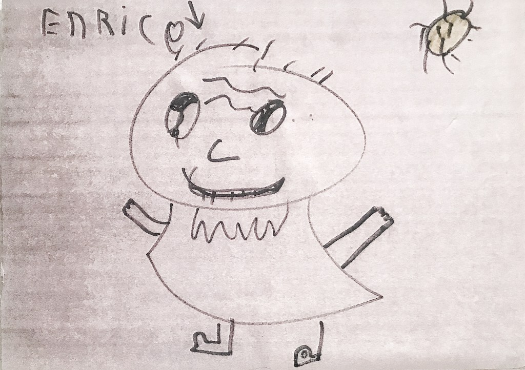 Los niños tienden a dibujar lo que ven y sienten de manera muy directa. Su percepción no está filtrada por las convenciones sociales o artísticas que los adultos a menudo internalizan. Esto puede llevar a representaciones sorprendentemente sinceras y perceptivas del sujeto. El ejemplo más claro es el retrato de mi persona que un niño me hizo durante la pandemia. Solo dibujó la barba que sobresalía de la mascarilla, y se inventó lo que no veía. El día que descubrió que debajo de la mascarilla también tenía barba, quiso rectificar el dibujo, pero le dije que me gustaba tal y como estaba.